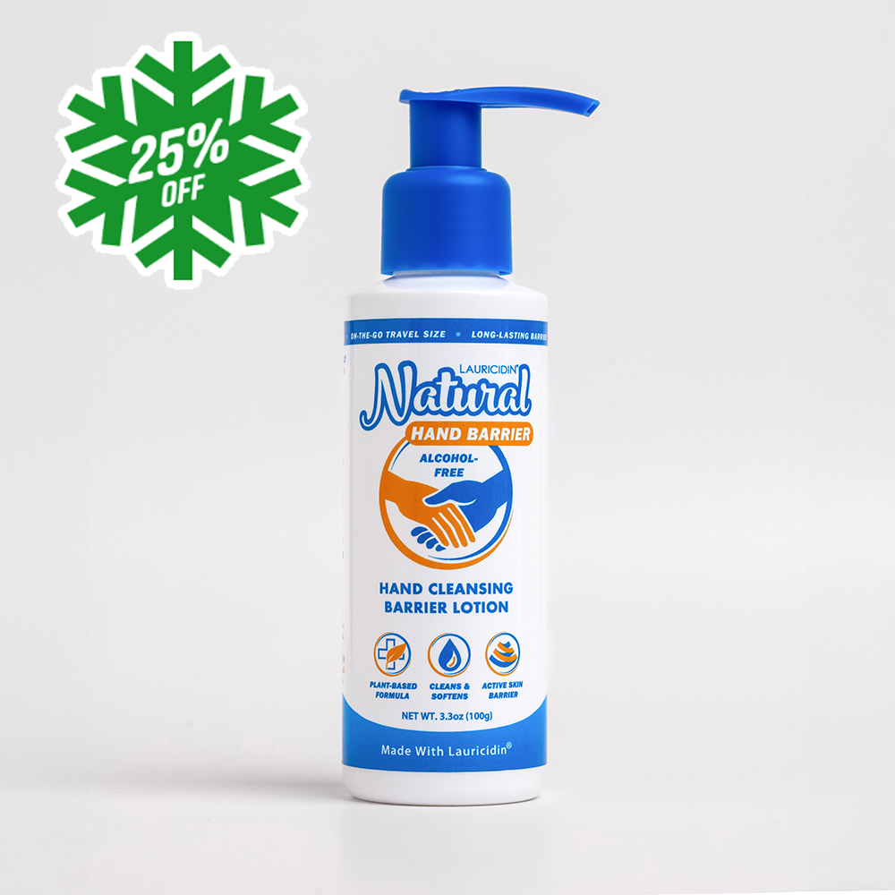 Lauricare™ Natural Hand Cleansing Barrier Lotion is free of many common ingredients found in commercial hand sanitizers and soaps and or soaps. It does NOT contain harsh ingredients such as: